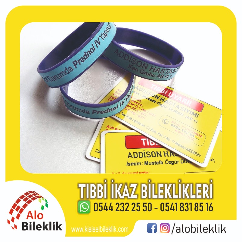 Bileklik çeşitlerinin yanında Tıbbi ikaz kartları ve Tıbbi ikaz etiketleride isteğinize bağlı olarak üretimleri yapılmaktıdır.